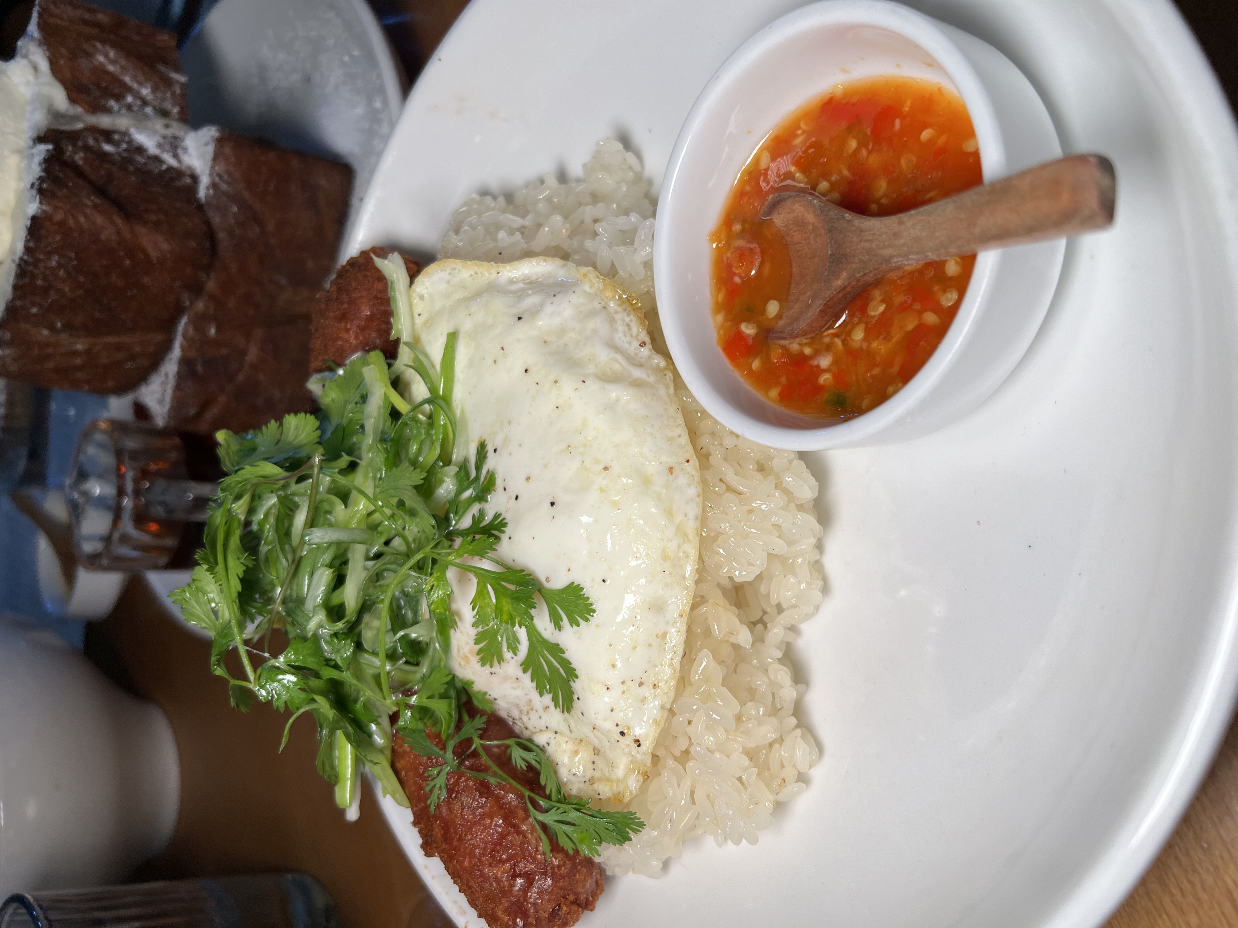 Diane's Place is one of the hottest restaurants in Minneapolis right now, serving Hmong-American cuisine in the cozy Northeast neighborhood. Executive Chef Diane Moua was recently recognized as a James Beard semifinalist for her work at Diane's Place, continuing to push the boundaries of Hmong cuisine. Diane's Place operates as a casual brunch cafe during the day, and transforms into a sophisticated dinner destination at night. As someone making a first visit to Diane's Place, I opted to go for the brunch menu and cafe. I was interested in the food, but also wanted to try the pastries. Although the menu wasn't the largest, there were a lot of dishes I wanted to try. The brunch menu uniquely blends Southeast Asian flavors into traditional Western breakfast foods. Notably, there are two savory croissant dishes: the sausage, egg, and cheese croissant with Hmong sausage and scallion cream cheese, and the spam and nori croissant. Additionally, the menu features a Thai Tea French Toast, made with croissant bread, vanilla whipped cream, and raspberries. There are also more traditional Hmong dishes, such as Hmong sausage, papaya noodle salad, rice and meat plates, and more. We wanted to try a little bit of the Hmong side as well as the fusion dishes. The service was a little slow. The food came out in reasonable time, it just felt like our server wasn’t always able to help us. Our water was sometimes empty, and there was a large gap in time between the first time she was at our table and when she came back to take our order and answer questions. However, our server was extremely kind and knowledgable. She was able to field off all questions we had about the menu and was able to accommodate anything we asked for. We started with the Hmong sausage with sticky rice. This dish comes with the choice of a sweet and sour sauce or Hmong hot sauce, as well as an optional fried egg for an extra three dollars, which we chose to add. I thought everything about this dish was perfect. The edge of the sausage was crispy, the meat itself was still moist, and it had amazing flavor. The side sauce added tanginess, sweetness, and spice to cut through the richness of the sausage and egg. The rice and garnish also helped to contrast the bold flavors of the sausage and side sauce to make for perfectly balanced bites. This was a classic dish executed flawlessly. Following the sausage, we went for the Thai Tea French Toast. I thought this was the most unique item on the menu. I rarely see French Toast adapted from its traditional preparation, and the Thai tea aspect really piqued my interest. Visually, the French toast was stunning. Two large pieces of toast stood on top of each other, perfectly rigid on the sides, topped with oozing whipped cream and raspberries with a side of syrup. The edge of the French toast was unbelievably crispy. It held its structure and was so satisfying to bite into, in contrast to the bread's fluffy, soft center. The bread also took on a surprisingly strong Thai tea flavor. I wasn't expecting it to come through so prominently. The raspberries were a perfect choice to cut through the sweetness of the whole dish. With all of the components being so sweet and rich, the tartness of the raspberries made each bite so much better while also adding a visual contrast that brightened up the plate. On the other hand, the Sweet Pork Bowl was not my favorite. All of the garnishes were delicious again, but the pork wasn't perfect. The flavor was spot on. It featured a deep and complex flavor that was not too sweet, but was deeply engrained in the pork. The accompanying sauce really enhanced the flavor and once again made for balanced and delicious bites. My only problem with this dish was that the texture of the pork itself wasn't great. Although the meat itself was really flavorful, it was dry and a little chewy. Despite this, I felt that the flavor was really impressive, and everything else about the dish was still great. The portion sizes were very reasonable. We couldn't even finish all of the food we ordered, so we took the leftovers in addition to some pastries to go. I would say all of the food was fairly priced, although the pastries trend towards the more expensive side. Just to try a pastry I was more familiar with, I ordered a chocolate croissant, but we also got the mango, passion fruit, lychee croissant, and the coconut pandan croissant. While still yummy, the chocolate croissant wasn't mind-blowing. The texture was flaky but not as chewy as I'd like, but the chocolate inside was delicious. As for the coconut pandan croissant, I actually thought it lacked flavor. It is filled with cream, which was rich but the flavor of the cream was very subtle. The mango, passion fruit, lychee croissant was definitely the hit for me. It wasn't exactly a croissant, but the filling was super delicious. Each of the fruits absolutely came through and the texture of the pastry was perfect making for a delicious dessert. When it comes to Diane's Place, expect bold and harmonious flavors with high levels of execution. The Thai Tea French Toast is a must order, but I also believe that the kitchen is talented enough that most dishes are probably equally as strong. Diane’s Place is deserving of all the hype and will definitely be on my list of places I hope to revisit in the future.