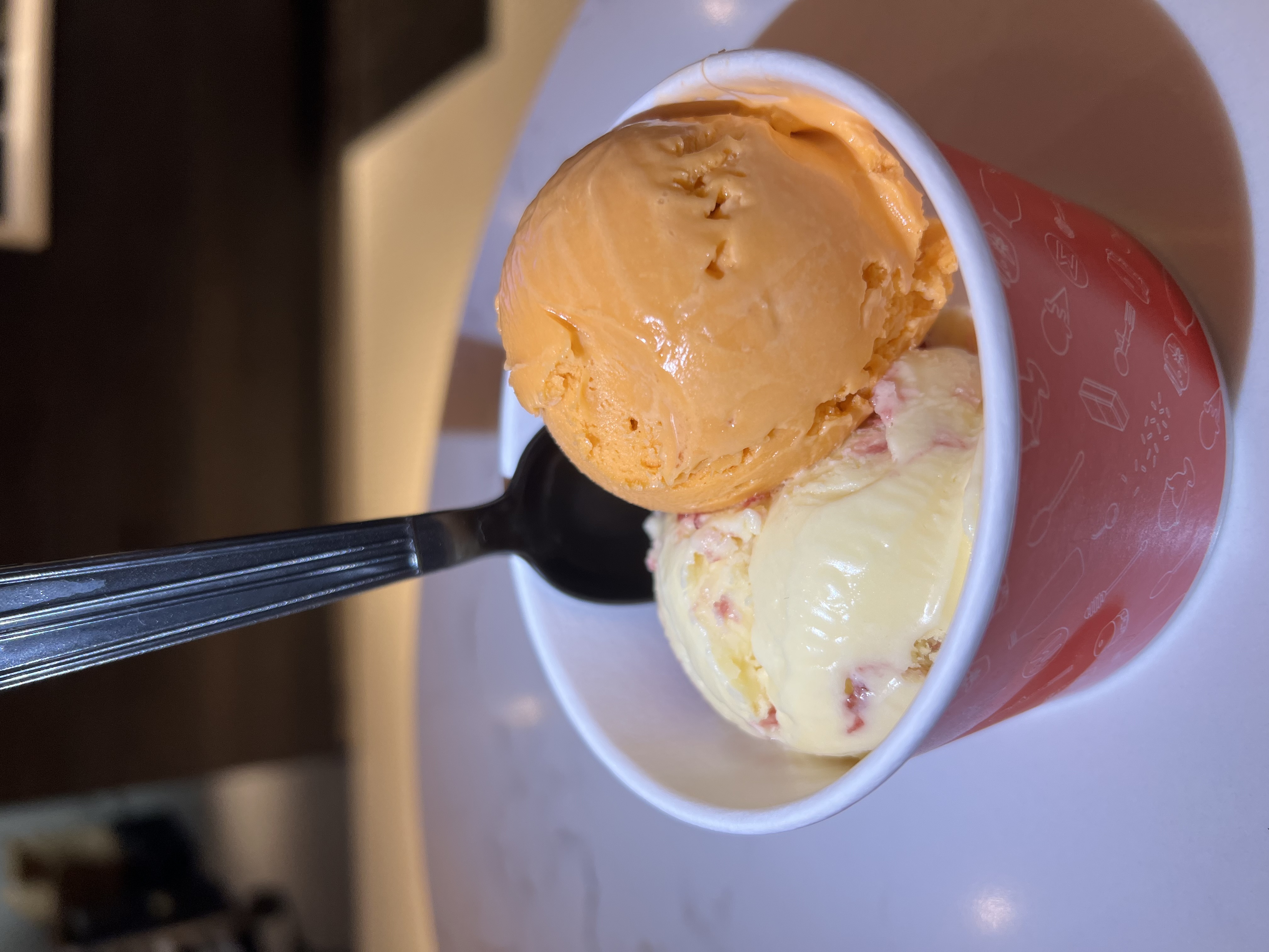 Milkjam Creamery is a small but inviting ice cream shop right next to World Street Kitchen. From the moment we walked in, the staff was immediately very welcoming and kind. There was one group ahead of us, but that gave us time to look through the list of unique flavors they had to offer. Most of the flavors had goofy names that added an element of fun to the experience that I appreciated. With only one employee working at the time, we waited a couple of minutes before being helped, but it was very reasonably quick. Given the fact that a lot of the flavors were unique, we wanted to try a lot of them, especially because it was our first time. Each month, there are a few rotating flavors. This month featured a Valentine's chocolate lineup. I ended up trying five flavors and felt too guilty to try more. I honestly was not a fan of most of the flavors I tried. I expected to enjoy the PB vs Everybody (a peanut butter banana ice cream with oreo chunks), but the banana really threw me off. The Tru Luv (milk chocolate truffle with chocolate almond crunch, caramel chocolate fudge) also had a "weird" kind of chocolate flavor that I didn't really enjoy. In retrospect, I'm not really sure how to describe it. I ended up choosing the Lemon Drizzle Cake and Ridin’ Duuurty (oreo milk with oreo chunks and salted peanut butter). The Lemon Drizzle Cake had a very pleasant textural contrast, and the lemon flavor was not too strong. It was just enough to come through without being bitter. As for the Ridin’ Duuurty, I was actually very hesitant to pull the trigger on this flavor. Typically, cookies ‘n cream is one of my favorite ice cream flavors, and I also tend to really like peanut butter-flavored sweets, so this seemed like it would be a no-brainer. But when I sampled it, the ice cream base tasted weird. It had “oreo milk”, which I wasn’t sure about, but definitely wasn’t quite what I was expecting. I ended up going for this flavor just because I was pretty sure I would still enjoy the flavor of two components I typically love in my desserts. I was surprised to see I actually enjoyed it slightly more after the fact. The peanut butter comes as a little cube that I didn’t really get in my sample bite, which definitely helped. As for the ice cream itself, it had a very nice consistency. The ice cream wasn’t overly creamy, yet it was still very rich and smooth. Although Milkjam has a lot of unique flavors, all of them are on the sweeter side. Even the default vanilla flavors are "sweet cream" and have "sweetened condensed milks". Because of this, I don't think Milkjam would be everyone's cup of tea, but they have so many interesting flavors that are at least worth giving a shot. Scoops are on the pricier side, with single scoops starting at 6.50, jumping to 8.50 for a single split scoop, and 11.50 for a double. If I were to come back, I probably wouldn't get anything more than a single. Scoop sizes aren't very generous, and an additional two dollars for the split scoop definitely didn't feel worth it. Milkjam wouldn't be my first choice, but every once in a while, I would be happy to come back to try out their rotating flavors and give others a shot.